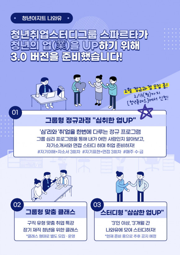 ½ºÅ͵ðÇü ¡®»ï»ïÇÑ ¾÷UP¡¯Àº ¡®3¡¯ÀÎ ÀÌ»ó û³â ±×·ìÀÌ ¡®3¡¯°³¿ù °£ û³â¾ÆÁöÆ® ³ª¿ÍÀ¯¿¡¼ ½ºÅ͵ð ¸ðÀÓÀ» Çϸé ÀÚ°ÝÁõ ÃëµæÁö¿øºñ, µµ¼ ±¸¸Åºñ, Ȱµ¿ºñ¸¦ Áö¿øÇÏ´Â »ç¾÷À¸·Î, ÀÎÅÏÀ̳ª ±â°£Á¦ ±Ù·ÎÀÚ·Î ±Ù¹«ÇÏ´Â ¹Ì·¡°¡ ºÒ¾ÈÁ¤ÇÑ Ã»³â ¼¼´ëÀÇ ³ëµ¿ Ư¼ºÀ» °í·ÁÇØ ºñÁ¤±ÔÁ÷ û³âÀÇ Ãë¾÷¿ª·® Çâ»óÀ» Áö¿øÇϱâ À§ÇØ Æí¼ºµÆ´Ù.