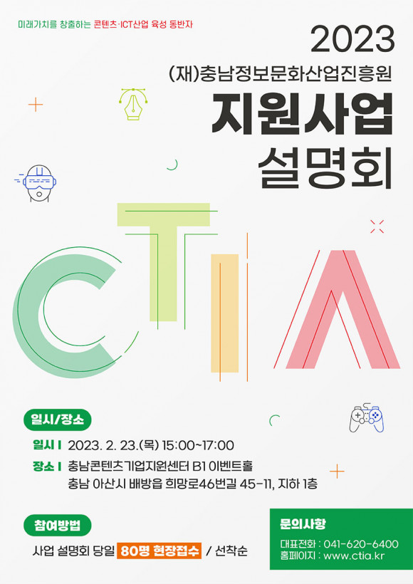 ¡®2023 Áö¿ø»ç¾÷ ¼³¸íȸ¡¯¿¡ ´ëÇÑ º¸´Ù ÀÚ¼¼ÇÑ Á¤º¸´Â ÁøÈï¿ø ȨÆäÀÌÁö(www.ctia.kr) ¶Ç´Â °æ¿µ±âȹ½Ç(041-620-6400)À¸·Î ¹®ÀÇÇÏ¸é µÈ´Ù.