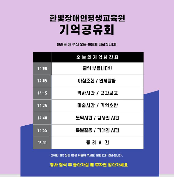 À̹ø ±â¾ï°øÀ¯È¸´Â ÇѺûÀå¾ÖÀξ߰£Çб³·Î 2005³â Àå¾ÖÀα³À°À» ½ÃÀÛÇϰí 2006³â ù °ËÁ¤°í½Ã ÇÕ°ÝÀÚ¸¦ ¹èÃâ, 2009³â¿¡´Â ù °ËÁ¤°í½Ã Á¹¾÷ ´ëÇлýÀ» ¹èÃâÇÏ´Â µî 13¸íÀÇ °ËÁ¤°í½Ã ÇÕ°ÝÀÚ¸¦ ¹èÃâÇϰí 60¿©¸íÀÇ Àå¾ÖÀÎÇб³(2010³â °³Äª)¸¦ ÇÔ²²ÇÑ »ç¶÷µéÀ» ºñ·Ô, 2007³â ÇѺûÀå¾ÖÀÎÆò»ý±³À°¿øÀ¸·Î °³¿øÇϰí 110¿©°³ÀÇ Àå¾ÖÀÎÆò»ý±³À°ÇÁ·Î±×·¥À¸·Î Àο¬À» ¸Î¾ú´ø »ç¶÷µé°ú ±³À°¿øÀÌ Áö¿ª¿¡ »Ñ¸®³»·Á »ý¸í·ÂÀ» °¡Áú ¼ö ÀÖµµ·Ï Áö¿øÀ» ¾Æ³¢Áö ¾Ê¾Ò´ø ¸¹Àº ºÐµé°ú ÇÔ²² Çß´Ù.
