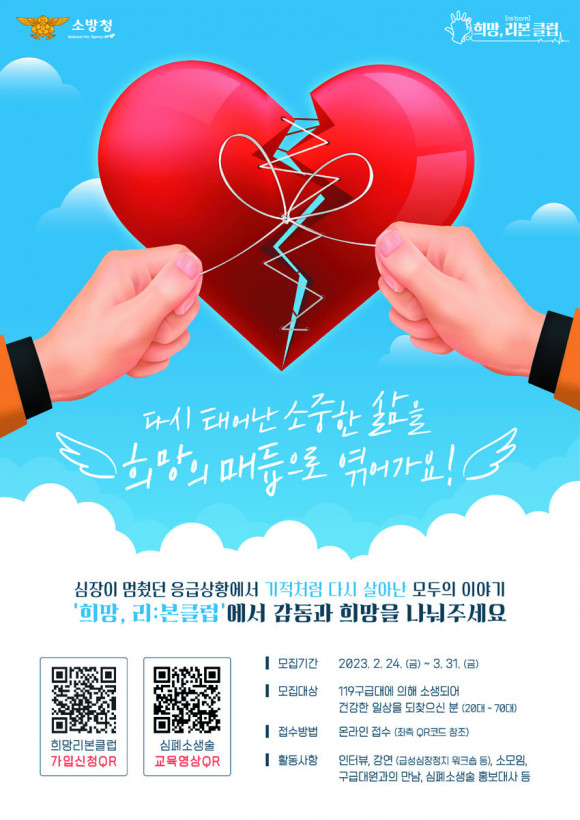 ¡®Èñ¸Á, ¸®:º»(Re:born)Ŭ·´¡¯À̶õ 119±¸±Þ´ëÀÇ Ã³Ä¡·Î ½ÉÁ¤Áö »óȲ¿¡¼ ¿ÏÀüÈ÷ ȸº¹µÅ ÀÏ»ó»ýȰÀ» ÇϰíÀÖ´Â ¼Ò»ýÀÚµéÀÇ ¸ðÀÓÀ» ¶æÇÏ°í ±¸±Þ´ë¿ø°ú »ýÁ¸ÀÚÀÇ ½Å·Ú µµ¸ð¿Í Áö¼ÓÀûÀÎ °ü¸®¡¤Á¤º¸ °øÀ¯¸¦ À§ÇØ ¸¶·ÃµÆ´Ù.