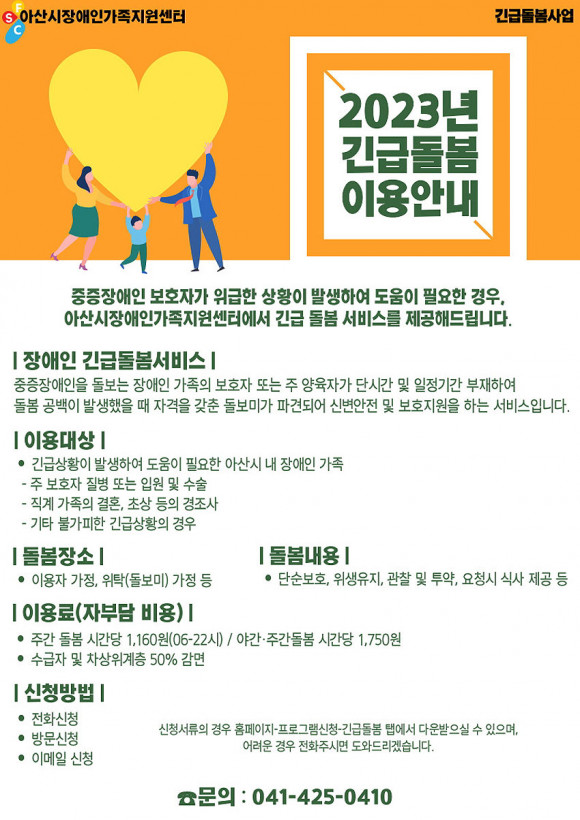 ¾Æ»ê½ÃÀå¾ÖÀΰ¡Á·Áö¿ø¼¾ÅÍ(041-425-0410)¿¡ ¼ºñ½º ÀÌ¿ëÀ» ½ÅûÇÒ ¼ö ÀÖÀ¸¸ç, µ¹º½ ½Ã°£Àº ȸ´ç 2½Ã°£ ÀÌ»ó, ¿¬°£ ÃÖ´ë 80½Ã°£(½Ã°£´ç 1õ160¿ø~1õ750¿ø ºñ¿ë ¹ß»ý, ¼ö±ÞÀÚ¡¤Â÷»óÀ§ °èÃþÀº 50% ºñ¿ë °¨¸é) ¹üÀ§¿¡¼ ÀÌ¿ëÇÒ ¼ö ÀÖ´Ù.
