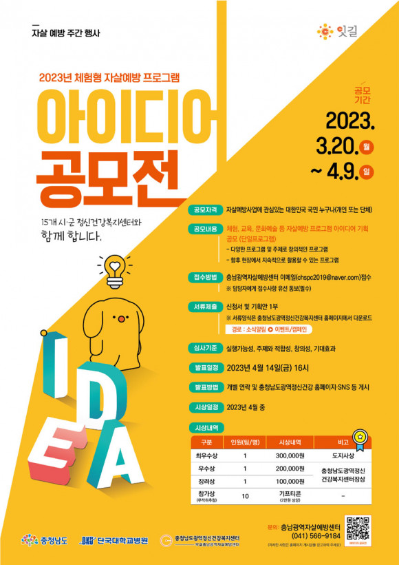 Á¤½Å°Ç° ÁõÁø, ÀÏ»ó ȸº¹, ÀÚ»ì ¿¹¹æ µîÀ» ÁÖÁ¦·Î ÇÑ Ã¼Ç衤±³À°¡¤¹®È¿¹¼ú °ü·Ã ÀÚ»ì ¿¹¹æ ÇÁ·Î±×·¥¿¡ ´ëÇÑ ¾ÆÀ̵ð¾î ±âȹÀ» °ø¸ðÇϸç, ÇöÀå¿¡¼ Áö¼Ó Ȱ¿ëÇÒ ¼ö Àִ âÀÇÀûÀÎ ÇÁ·Î±×·¥À» ¸ðÁýÇÑ´Ù.