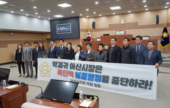 ¾Æ»ê½ÃÀÇȸ ÀÇ¿ø Àϵ¿Àº Áýȸ¸¦ ÇÏ¸ç ¹Ú ½ÃÀåÀÌ À߸øµÈ °áÁ¤À» ¹Ù·ÎÀâÀ» ¼ö ÀÖµµ·Ï ÃæºÐÇÑ ½Ã°£À» ÁÖ¾úÀ½¿¡µµ °íÁý°ú ºÒÅ븸À» È®ÀÎÇß°í, ¾Æ»ê½ÃÀÇ¿ø°ú ÇкθðµéÀÇ °£ÀýÇÑ ¿Üħµµ ºÒÅëÀÇ º® ¾Õ¿¡¼± ¹«·ÂÇÏ´Ù´Â °ÍÀ» Àý°¨ÇßÀ» »ÓÀ̶ó¸ç ¹Ú ½ÃÀåÀ» ¼ºÅäÇß´Ù.