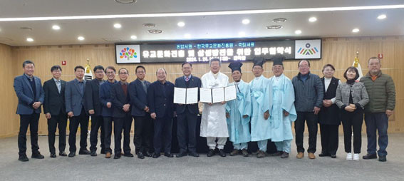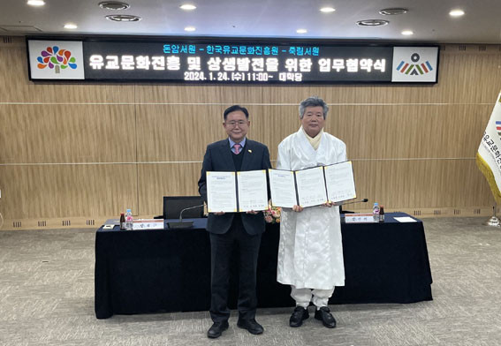 Çù¾à½Ä¿¡¼ Á¤Àç±Ù ¿øÀåÀº ¡°³í»êÀÇ ¼ÒÁßÇÑ À¯±³¹®È À¯»êÀÌÀÚ ÃæÃ»À¯±³ÀÇ »ê½ÇÀÎ µ·¾Ï¼¿ø, Á׸²¼¿ø°ú Çù¾àÀ» ü°áÇÏ°Ô µÇ¾î ±â»Ú´Ù¡±¶ó°í ¹àÈ÷¸ç, ¡°¿À´Ã Çù¾àÀ» °è±â·Î ÇÑÀ¯Áø°ú µÎ ¼¿øÀº Çѱ¹À¯±³¹®È ¹ßÀüÀ» ÁÖµµÇØ ³ª°¡±â À§ÇÏ¿© Àû±Ø ±³·ùÇϰí Çù·ÂÇÒ °Í¡±À̶ó°í ¸»Çß´Ù.