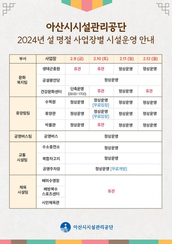 ¾Æ»ê½Ã½Ã¼³°ü¸®°ø´Ü(ÀÌÇÏ °ø´Ü)Àº ¼³ ¸íÀý ¿¬ÈÞ ±â°£ ½Ã¹ÎµéÀÇ ¾ÈÀüÇÑ ½Ã¼³ ÀÌ¿ëÀ» À§ÇØ ¡®¼³ ¸íÀý ¿î¿µ°èȹ¡¯À» ¼ö¸³Çß´Ù°í 2¿ù 6ÀÏ ¹àÇû´Ù.