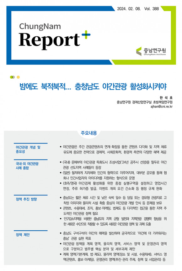 Ãæ³²¿¬±¸¿ø ÇѼ®È£ ÃʺùÃ¥ÀÓ¿¬±¸¿øÀº ¡®Ãæ³² ¾ß°£°ü±¤ Ȱ¼ºÈ Àü·« ¿¬±¸¡¯(Ãæ³²¸®Æ÷Æ®Ç÷¯½º Á¦388È£)¿¡¼ ¡°Ãæ³²µµ´Â ªÀº ü·ù ½Ã°£ ¹× ³·Àº ¼÷¹Ú Àϼö µî ´çÀÏ ¶Ç´Â °æÀ¯Çü °ü±¤°´ÀÌ »ó´ëÀûÀ¸·Î ¸¹°í, ¹°¸®Àû ½Ã¼³ È®Ãæ Áß½ÉÀÇ ¾ß°£°ü±¤ °³¹ß ÀÎ½Ä µî °³¼±ÇØ¾ß ÇÒ ¹®Á¦µéÀ» °®°í ÀÖ´Ù¡±¸ç ¡°¾ß°£°ü±¤Àº ÁÖ°£ °ü±¤ÄÜÅÙÃ÷ÀÇ ¿¬°è¡¤È®ÀåÀ̶ó´Â Ãø¸é¿¡¼ ÄÜÅÙÃ÷ ´Ù°¢È¿Í Áö¿ª ü·ù À¯µµ¿¡ Áß¿äÇÑ Àü·«À¸·Î Ȱ¿ëµÉ ¼ö ÀÖ´Ù¡±°í ¸»Çß´Ù.