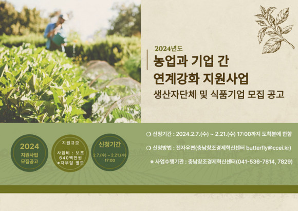| | ¨Ï ¿Â¾ç½Å¹® | | Ãæ³²Ã¢Á¶°æÁ¦Çõ½Å¼¾ÅÍ´Â ÃæÃ»³²µµ¿Í ÇÔ²² ³ó¾÷°ú ±â¾÷ °£ »ó»ýÇù·Â ¸ðµ¨ ¹ß±¼ ¹× µ¿¹Ý¼ºÀåÀ» µµ¸ðÇϰíÀÚ ¡®2024³â ³ó¾÷°ú ±â¾÷ °£ ¿¬°è°È Áö¿ø»ç¾÷ »ý»êÀÚ´Üü ¹× ½Äǰ±â¾÷¡¯À» Áö³ 2¿ù 7ÀϺÎÅÍ ¸ðÁýÇϰí ÀÖ´Ù.