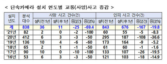 Ãæ³²°æÂûû(ûÀå ¿À¹®±³)Àº Áö³ 2016³âºÎÅÍ 2021³â »çÀÌ µµ³» ¼³Ä¡µÈ ±³Åë ´Ü¼ÓÄ«¸Þ¶ó 838´ëÀÇ ¼³Ä¡ÁöÁ¡ ¹Ý°æ 50m À̳»ÀÇ ¼³Ä¡ ÀüÈÄ ¿¬µµ ±³Åë»ç°í Áõ°¨À» °ø°£ºòµ¥ÀÌÅÍ ºÐ¼®ÇÁ·Î±×·¥*À» »ç¿ëÇØ ºÐ¼®ÇÑ °á°ú, »ç¸Á»ç°í´Â Æò±Õ 69.4%, ÀθíÇÇÇØ»ç°í´Â Æò±Õ 19.8% °¨¼ÒÇß´Ù°í ¹ßÇ¥Çß´Ù.