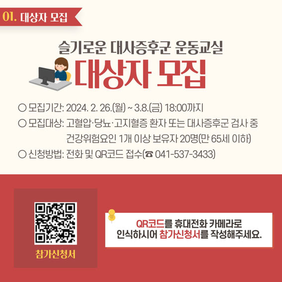 Âü¿© ÀÚ°ÝÀº ¡ã65¼¼ ÀÌÇÏ ¡ã°íÇ÷¾Ð¡¤´ç´¢º´¡¤°íÁöÇ÷Áõ ȯÀÚ ¶Ç´Â °íÇ÷¾Ð¡¤´ç´¢º´ µî ¾à¹°º¹¿ë Àü´Ü°èÀÇ ¾Æ»ê½Ã¹ÎÀ̸ç, Âü¿© ½ÅûÀº QRÄÚµå Á¢¼Ó ¶Ç´Â ÀüÈ Á¢¼ö(¢Ï041-537-3433)·Î °¡´ÉÇÏ´Ù.