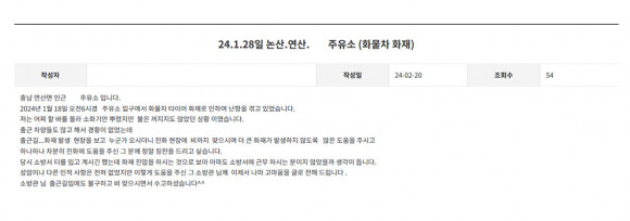 ÀÌ¾î ¼Ò¹æ´ë°¡ ÇöÀå¿¡ µµÂøÇØ ¿ÏÀüÈ÷ ÈÀ縦 Áø¾ÐÇÑ °ÍÀ» È®ÀÎÇÑ ½Å ¼Ò¹æÀåÀº Á¶¿ëÈ÷ ÀÚ¸®¸¦ ¶°³µÀ¸³ª, ÃÖ±Ù ¡®ÄªÂùÇսô١¯ °Ô½ÃÆÇ¿¡ ´ç½Ã »óȲÀÌ ÀûÈù °Ô½Ã±ÛÀÌ ¿Ã¶ó¿À¸é¼ ¾Ë·ÁÁö°Ô µÆ´Ù.