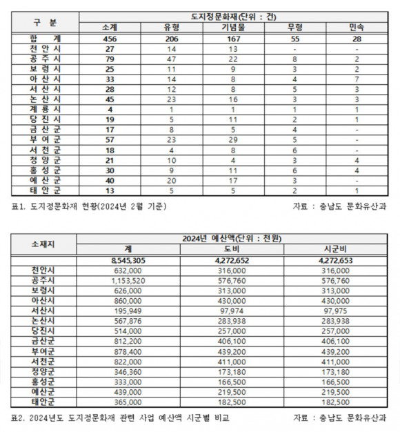 µµ ¹®ÈÀ¯»ê°ú¿¡ µû¸£¸é Ãæ³²ÀÇ 456°³ µµÁöÁ¤¹®ÈÀç Áß 45°³°¡ ³í»ê¿¡ À§Ä¡Çϰí ÀÖÀ¸¸ç, ÀÌ´Â °øÁÖ 79°³, ºÎ¿© 57°³¿¡ ÀÌ¾î ¼¼ ¹øÂ°·Î ¸¹Àº ¼öÄ¡´Ù. Ãæ³²µµÀÇ ¿ÃÇØ µµÁöÁ¤¹®ÈÀç °ü·Ã »ç¾÷ ¿¹»ê¾×Àº ÃÑ 42¾ï 7õ265¸¸ ¿øÀÌ´Ù.