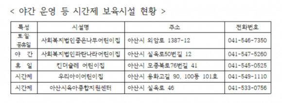 ½Ã°¡ Áö¿øÇÏ´Â ½Ã°£Á¦ º¸À° ¼ºñ½º·Î´Â ¡ã19½Ã 30ºÐºÎÅÍ ÀÍÀÏ 7½Ã 30ºÐ±îÁö º¸È£ÀÚÀÇ »çÁ¤À¸·Î º¸À°ÀÌ ¾î·Á¿î ¾Æµ¿À» º¸À°ÇÏ´Â ¾ß°£ ¾î¸°ÀÌÁý ¡ãÀÏ¿äÀÏ ¹× °øÈÞÀÏ¿¡ º¸À° ¼ºñ½º¸¦ Á¦°øÇÏ´Â ÈÞÀÏ ¾î¸°ÀÌÁý ¡ã°¡Á¤¾çÀ° ¾Æµ¿ÀÌ ½Ã°£ ´ÜÀ§·Î ÀÌ¿ëÇÑ ½Ã°£¸¸Å º¸À°·á¸¦ ³³ºÎÇϰí ÀÌ¿ëÇÏ´Â ½Ã°£Á¦ º¸À°½Ã¼³ÀÌ ÀÖ´Ù.