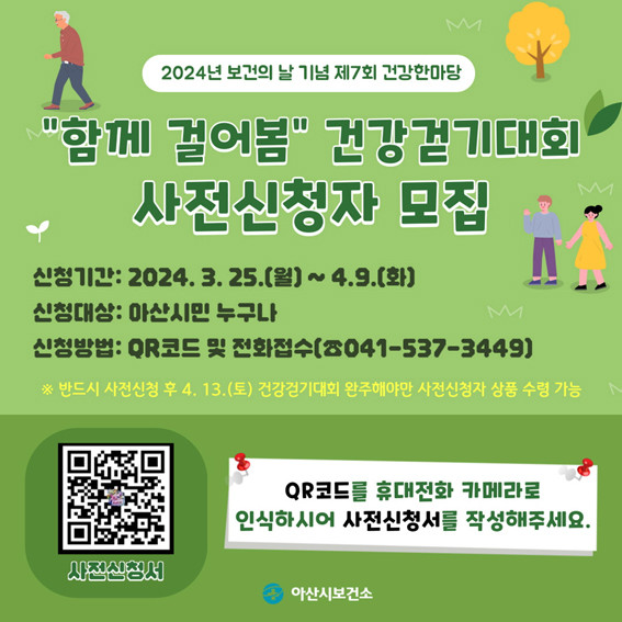 ¾Æ»ê½Ã¹ÎÀ̶ó¸é ´©±¸³ª Âü¿©ÇÒ ¼ö ÀÖÀ¸¸ç, »çÀü ½Åû ÈÄ °È±â´ëȸ ¿ÏÁÖ ½Ã Ãß°¡ ±â³äǰÀÌ Á¦°øµÉ ¿¹Á¤ÀÌ´Ù. »çÀü ½ÅûÀº QRÄÚµå Á¢¼Ó ¶Ç´Â ÀüÈ Á¢¼ö(041-537-3449)·Î °¡´ÉÇÏ´Ù.