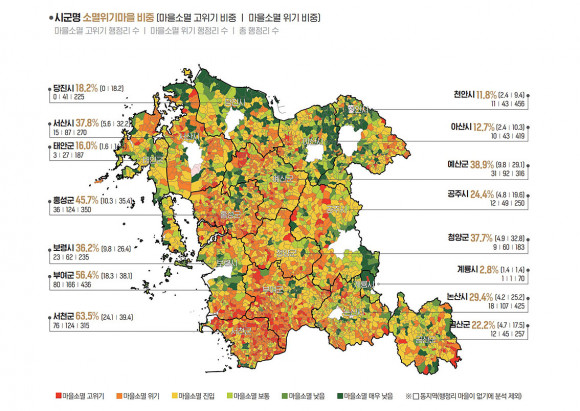 ¸¶À»¼Ò¸êÁö¼ö¸¦ Àû¿ëÇÑ °á°ú, Ãæ³² 15°³ ½Ã¡¤±ºÀÇ ¼Ò¸êÀ§±â¸¶À»(¸¶À»¼Ò¸ê °íÀ§±â+À§±â)Àº ÃÑ 4õ394°³ Áß 1õ408°³·Î 32%¿¡ ÇØ´çÇÑ´Ù. ¸¶À»¼Ò¸ê ÁøÀԴܰè±îÁö Æ÷ÇÔÇϸé 62.1%·Î ³ªÅ¸³µ´Ù. ÀÌ´Â ÇàÁ¤¸® ¸¶À»ÀÌ ¾ø´Â µ¿Áö¿ªÀº ºÐ¼®¿¡¼ Á¦¿ÜµÈ °á°ú´Ù.