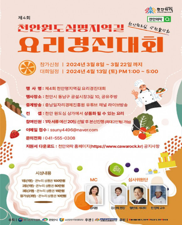 Á¦4ȸ õ¾È¿øµµ½É ¸íÁö¿ª±æ ¿ä¸®°æÁø´ëȸ¿Í °ü·ÃµÈ ÀÚ¼¼ÇÑ ³»¿ëÀº õ¾È¿Í¶ô ȨÆäÀÌÁö(www.cawarock.kr)¸¦ ÅëÇØ È®ÀÎÇÒ ¼ö ÀÖ´Ù.