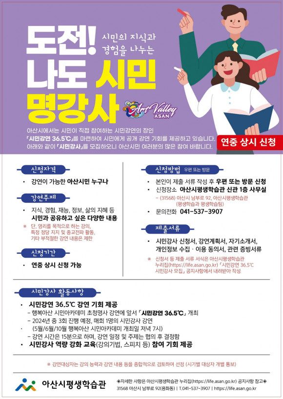 ¡®½Ã¹Î °¿¬ 36.5¡É¡¯ ½Ã¹Î °»ç ¸ðÁý ¹× ½Åû°ú °ü·ÃÇÑ ÀÚ¼¼ÇÑ »çÇ×Àº ¾Æ»ê½ÃÆò»ýÇнÀ°ü ´©¸®Áý(https://life.asan.go.kr) °øÁö»çÇ×À» Âü°íÇϰųª, ¾Æ»ê½Ã Æò»ýÇнÀ°ú Æò»ýÇнÀÆÀ(¢Î041-537-3907)À¸·Î ¹®ÀÇÇÏ¸é µÈ´Ù.