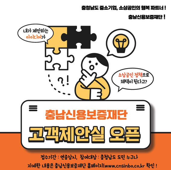 ¡®°í°´Á¦¾È½Ç¡¯ °ü·Ã ÀÚ¼¼ÇÑ »çÇ×Àº Ãæ³²½Å¿ëº¸ÁõÀç´Ü ȨÆäÀÌÁö(www.cnsinbo.co.kr)¿¡¼ È®ÀÎ ¹× Á¦¾ÈÀÌ °¡´ÉÇÏ´Ù.