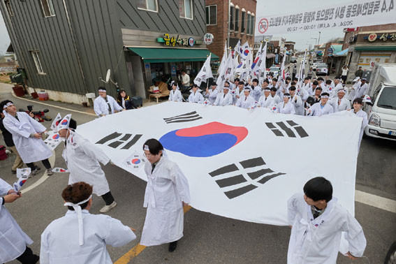 À̾î űر⸦ ¾ç¼Õ¿¡ µé°í °Å¸®·Î ³ª¼± Âü°¡ÀÚµéÀº 4¡¤4 ¸¸¼¼¿îµ¿ ±â³ä°ø¿ø¿¡¼ ±â¹Ìµ¶¸³¹«Àθê¿Ö¿îµ¿±â³äž±îÁö ¾à 1km ±¸°£À» ÇàÁøÇÏ¸ç ¡®´ëÇѵ¶¸³ ¸¸¼¼¡¯¸¦ ¿ÜÃÆ´Ù.