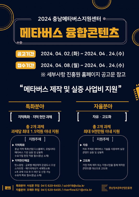 Ãæ³²Á¤º¸¹®È»ê¾÷ÁøÈï¿ø Ãæ³²¸ÞŸ¹ö½ºÁö¿ø¼¾ÅÍ´Â ¸ÞŸ¹ö½º °³¹ßÀ» ÅëÇÑ Áö¿ªÆ¯È»ê¾÷ÀÇ µðÁöÅÐÀüȯ, Áö¿ª Çö¾È ÇØ°á¿¡ ±â¿© °¡´ÉÇÑ °úÁ¦¸¦ ¹ß±¼ÇϰíÀÚ ÃÑ 4¾ï 5õ¸¸ ¿øÀ» Áö¿øÇÏ´Â ¡®2024³â ¸ÞŸ¹ö½º À¶ÇÕÄÜÅÙÃ÷ Áö¿ø»ç¾÷¡¯À» °ø¸ðÇÑ´Ù°í ¹àÇû´Ù.