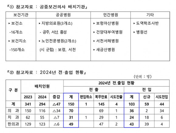 ¿ÃÇØ µµ³»¿¡ ¹èÄ¡ÇÑ °øÁߺ¸°ÇÀÇ»ç´Â ½Å±Ô 59¸í, Ÿ ½Ãµµ ÀüÀÔ 44¸íÀ¸·Î Àǰú 36¸í, Ä¡°ú 24¸í, ÇÑÀǰú 43¸í µî ÃÑ 103¸íÀÌ´Ù.