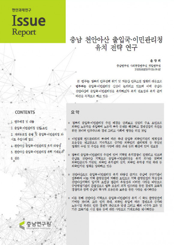 µµ´Â Ãæ³²¿¬±¸¿ø(Ã¥ÀÓ¿¬±¸¿ø À±ÇâÈñ)À» ÅëÇØ ¡®Ãæ³² õ¾È¡¤¾Æ»ê ÃâÀÔ±¹¡¤À̹ΰü¸®Ã» À¯Ä¡ Àü·« ¿¬±¸¡¯¸¦ ½Ç½Ã, ¡âÃâÀÔ±¹¡¤À̹ΰü¸®Ã» ¼³¸³ ¿äÀÎ ¡âÀç¿Üµ¿Æ÷û Ãâ¹ü ¡âÃâÀÔ±¹¡¤À̹ΰü¸®Ã» Ÿ ½Ãµµ À¯Ä¡ ÃßÁø »ç·Ê ¡âõ¾È¡¤¾Æ»ê ÃâÀÔ±¹¡¤À̹ΰü¸®Ã» À¯Ä¡ Ÿ´ç¼º ¹× ±â´ëÈ¿°ú µîÀ» ºÐ¼®Çß´Ù.