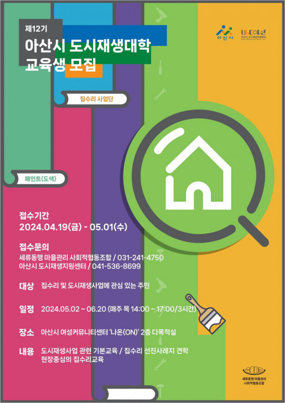 ±³À° ÀÏÁ¤Àº 5¿ù 2ÀϺÎÅÍ 6¿ù 20ÀϱîÁö ¸ÅÁÖ ¸ñ¿äÀÏ ÁÖ 1ȸ ½Ç½ÃÇϸç, µµ½ÃÀç»ý»ç¾÷ ±³À°, Áý¼ö¸®¿¡ ÇÊ¿äÇÑ °ø±¸ »ç¿ë¹ý, Áý¼ö¸® ÇöÀå½Ç½À µîÀÇ ±³À°À» ½ÃÇàÇÑ´Ù. ±³À° Àå¼Ò´Â µµ½ÃÀç»ý»ç¾÷À¸·Î Á¶¼ºµÈ ¾Æ»ê½Ã ¿©¼ºÄ¿¹Â´ÏƼ¼¾ÅÍ´Ù.