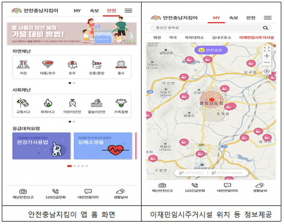 ¾ÈÀüÃæ³²ÁöÅ´ÀÌ ¾ÛÀº °¢Á¾ Àç³À¸·ÎºÎÅÍ µµ¹ÎÀÇ ¾ÈÀüÀ» Áö۱â À§ÇØ ¿î¿µ ÁßÀÎ °ÍÀ¸·Î, µµ´Â 2017³â °³¼³ÇÑ ÃæÃ»³²µµ Àç³¾ÈÀü Æ÷ÅÐ(https://safe.chungnam.go.kr/)¿¡¼ Á¦°øÇÏ´Â Á¤º¸¸¦ ¸ð¹ÙÀÏ È¯°æ¿¡¼µµ ÀÌ¿ëÀÚ°¡ Æí¸®ÇÏ°Ô Á¦°ø¹ÞÀ» ¼ö ÀÖµµ·Ï ±â´É °³¼±(°íµµÈ)À» °ÅÃÄ 2018³âºÎÅÍ ¾ÛÀ¸·Î ¼ºñ½ºÇϰí ÀÖ´Ù.