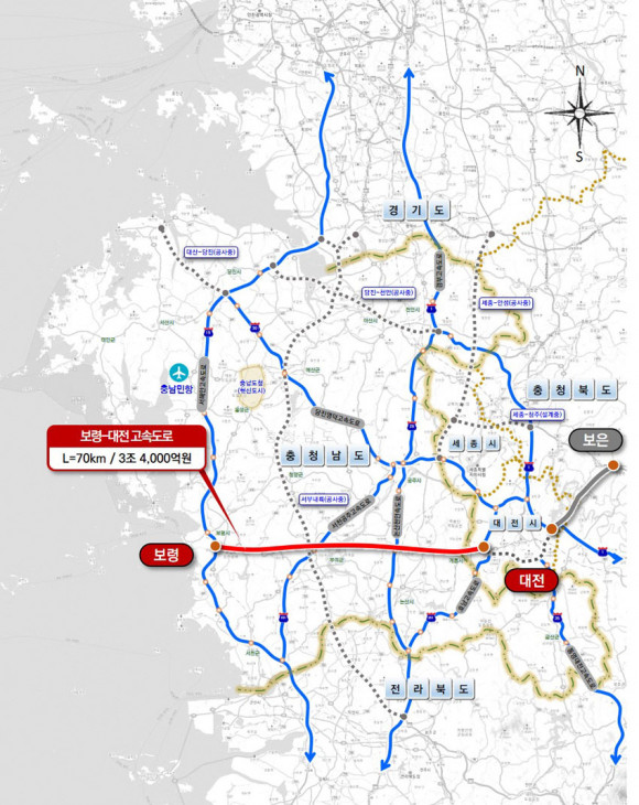 º¸·É-´ëÀü °í¼Óµµ·Î´Â ÃæÃ» µ¿¼Ãà °í¼Óµµ·Î °Ç¼³À» ÅëÇÑ ¡â¼ÇØ¾È Á¢±Ù¼º Çâ»ó ¡â°ü±¤»ê¾÷ ¹× ¹°·ù Ȱ¼ºÈ ¡â±ÕÇüÀûÀÎ ÁßºÎ±Ç µ¿¼ °í¼Óµµ·Î¸Á ±¸Ãà µîÀ» À§ÇØ ´ëÅë·É Áö¿ª°ø¾àÀÌÀÚ ¹Î¼±8±â µµÁö»ç °ø¾àÀ¸·Î °Ç¼³ ÃßÁø ÁßÀÌ´Ù.