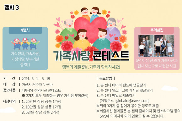 ÇÑÆí, 5¿ù 1ÀϺÎÅÍ 19ÀϱîÁö´Â ¿Â¶óÀÎÀ¸·Î ÁøÇàµÇ´Â °¡Á·»ç¶û ÄÜÅ×½ºÆ®´Â ¡®°¡Á·¼¾ÅÍ, °¡Á·»ç¶û, °¡Á¤ÀÇ ´Þ, ºÎºÎÀÇ ³¯¡¯ Áß ÇÑ ´Ü¾î¸¦ ¼±ÅÃÇÏ¿© 4Çà½Ã¸¦ Áþ°Å³ª, ¿¹Àü¿¡ ÂïÀº °¡Á·°úÀÇ »çÁøÀ» ÀçÇöÇÏ¿© ÃÔ¿µÇÏ¿© Á¦ÃâÇÏ´Â ÄÜÅ×½ºÆ®·Î, °¡Á·¿¡ ´ëÇØ »ý°¢Çغ¸°í °¡Á·¾Ö(äñ)¸¦ ´À³¥ ¼ö ÀÖ´Â Çà»ç´Ù.