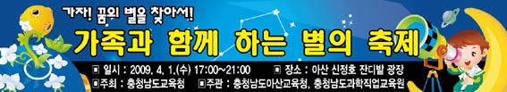 º½¹ãÀÇ ½Ì±×·¯¿î ³»À½ °¡µæÇÑ ½ÅÁ¤È£ Àܵð¹ç ±¤Àå¿¡¼ ¿À´Â 4¿ù 1ÀÏ ¿ÀÈÄ5½ÃºÎÅÍ ¡®2009 °¡Á·ÀÌ ÇÔ²²ÇÏ´Â º°ÀÇ ÃàÁ¦¡¯°¡ ¿¸°´Ù. À̹ø º°ÃàÁ¦´Â Ãæ³²µµ±³À°Ã»ÀÌ ÁÖÃÖÇϰí Ãæ³²µµ°úÇÐÁ÷¾÷±³À°¿ø°ú ¾Æ»ê±³À°Ã»ÀÌ ÁÖ°üÇÏ´Â Çà»ç·Î¼ 3³â ¸¸¿¡ ¿ì¸® °íÀå ¾Æ»ê¿¡¼ ¿¸®°Ô µÈ´Ù. ¾Æ»ê¿¡¼ ½Ç½ÃµÇ´Â º° ÃàÁ¦´Â 20¿©´ëÀÇ ¸Á¿ø°æÀ» ÀÌ¿ëÇØ ´Þ, ¼ö¼º, ±Ý¼º°ú Å伺À» °üÃø¼Òº°·Î ³ª´©¾î °üÃøÇϰí, °úÇнÇÇè ºÎ½º 24°³¸¦ ¿î¿µÇØ Çлýµé¿¡°Ô °úÇÐÀû ޱ¸´É·ÂÀ» ±æ·¯ ÁÙ ¼ö ÀÖ´Â ÇÁ·Î±×·¥À¸·Î ±¸¼ºµÇ¾î ÀÖ´Ù. ÇлýµéÀÇ °úÇÐÀû ޱ¸´É·ÂÀ» ½ÅÀå½Ã۰í, ²ÞÀ» °®°Ô ÇÏ´Â º°ÃàÁ¦´Â Çлý, ±³¿ø, Çкθð, Áö¿ªÁÖ¹ÎÀÌ ÇÔ²² ÇÏ´Â ÃàÁ¦ÀÇ ÇѸ¶´çÀÌ µÉ °ÍÀ¸·Î º¸ÀδÙ. ±³À°Ã» °ü°èÀÚ´Â ¡°ÇÏ·ç°¡ ´Ù¸£°Ô ±Þ¼Óµµ·Î ¹ßÀüÇÏ´Â ¼¼°è ¼ÓÀÇ ³ì»ö÷´Üµµ½Ã ¾Æ»ê¿¡ °É¸Â´Â À§´ëÇÑ ¸íǰ ¾Æ»ê ±³À°À» ²Þ²Ù¸ç ¸ðµç ±³À°°øµ¿Ã¼ÀÇ ¿ª·®À» ¸ð¾Æ ³ë·ÂÇϰí ÀÖ´Â ¾Æ»ê±³À°¿¡ ¸ðµç ½Ã¹Î°ú ÇлýµéÀÌ Âü¿©ÇÏ¿© ¼º°øÀûÀÎ º°ÃàÁ¦°¡ µÇ±â¸¦ Èñ¸ÁÇÑ´Ù¡±°í ÀüÇß´Ù.