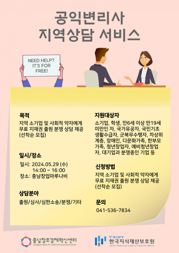 ÇØ´ç ¼ºñ½º´Â Çѱ¹Áö½ÄÀç»êº¸È£¿ø°úÀÇ Çù·ÂÀ» ÅëÇØ Ãæ³²Ã¢¾÷¸¶·ç³ªºñ ÀÔÁÖ±â¾÷ ¹× Ãæ³²¼ÒÀç (¿¹ºñ)â¾÷ÀÚ¸¦ ´ë»óÀ¸·Î ¹«·á º¯¸®¼ºñ½º Áö¿ø ¹× ÁöÀç±Ç âÃ⡤Ȱ¿ëÀ» µµ¸ðÇÏ´Â ¼ºñ½ºÀÌ´Ù.