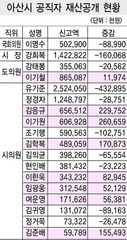 Á¤ºÎ°øÁ÷ÀÚÀ±¸®À§¿øÈ¸´Â Áö³ 3¿ù 27ÀÏ 2008³â 1³â°£ÀÇ °øÁ÷ÀÚ Àç»êº¯µ¿½Å°í ³»¿ªÀ» °ø°³Çß´Ù. ÀÌ´Â °øÁ÷ÀÚÀ±¸®¹ý Á¦6Á¶, Á¦10Á¶¿¡ ±Ù°ÅÇÑ °ÍÀÌ´Ù. ÀÌ¿¡ µû¶ó Ãæ³²°øÁ÷ÀÚÀ±¸®À§¿øÈ¸ °üÇÒ 16°³ ½Ã¡¤±º ÀÇȸ ÀÇ¿ø µî µîÀº 27ÀÏÀÚ µµº¸ ¹× Ãæ³²µµ ȨÆäÀÌÁö¸¦ ÅëÇØ, Á¤ºÎ°øÁ÷ÀÚÀ±¸®À§¿øÈ¸ °üÇÒ µµÁö»ç, ¿Í µµÀÇ¿ø, ½Ã¡¤±º ´ÜüÀå µî ÃÑ 58¸íÀº °üº¸ ¹× ÀüÀÚ°üº¸(http://gwanbo.korea.go.kr)¿¡ Àç»êº¯µ¿½Å°í ³»¿ªÀ» °ø°³Çß´Ù. °ø°³µÈ ÀÚ·á¿¡ ÀÇÇϸé À̸í¼ö ±¹È¸ÀÇ¿øÀº 5¾ï9õ189¸¸¿ø¿¡¼ 8õ899¸¸¿ø °¨¼ÒÇÑ 5¾ï290¸¸¿øÀ» ½Å°íÇß°í °Èñº¹ ½ÃÀåÀº 15¾ï8õ352¸¸¿ø¿¡¼ 1¾ï6õ68¸¸¿øÀÌ °¨¼ÒÇÑ 14¾ï2õ283¸¸¿øÀ» ½Å°íÇß´Ù. Ãæ³²µµÀÇȸ °ÅºÀ ÀÇÀåÀº 3¾ï7õ562¸¸¿ø¿¡¼ 2õ56¸¸¿øÀÌ °¨¼ÒÇÑ 3¾ï5õ506¸¸¿ø, À̱âö ÀÇ¿øÀº Á¾Àü 8¾ï5õ311¸¸¿ø¿¡¼ 1õ197¸¸ÀÌ Áõ°¡ÇÑ 8¾ï6õ508¸¸¿øÀ» ½Å°íÇß´Ù. ½ÃÀÇ¿ø °¡¿îµ¥ ÃÖ°í Àç·Â°¡´Â Áö³ÇØ¿¡ ÀÌ¾î ¶Ç´Ù½Ã À¯±âÁØ ÀÇ¿øÀÌ Â÷ÁöÇß´Ù. À¯ ÀÇ¿øÀº Á¾Àü 29¾ï5õ694¸¸¿ø¿¡¼ 4¾ï3õ289¸¸¿øÀÌ °¨¼ÒÇÑ 25¾ï2õ405¸¸¿øÀ» ½Å°íÇß´Ù. ±×·¯³ª À¯ ÀÇ¿øÀÇ Àç»ê°¨¼ÒÆøÀº Ãæ³² ½Ã¡¤±ºÀÇ¿øÁß ¼¼¹øÂ° Å« ÆøÀÇ °¨¼Ò¿¡ ÇØ´çµÈ´Ù. ÀÌó·³ Å« ÆøÀÇ °¨¼ÒÀÌÀ¯´Â ÅäÁö ÀӴ뺸Áõ±Ý 乫Áõ°¡¿Í ÁÖÅñ¸ÀÔ ´ëÃâ ¶§¹®À̶ó°í ¹àÇû´Ù. À̾î Á¤°æÀÚ ÀÇ¿øÀÌ Á¾Àü 12¾ï7õ736¸¸¿ø¿¡¼ 2õ857¸¸¿øÀÌ °¨¼ÒÇÑ 12¾ï4õ879¸¸¿ø, ±èÀÀ±Ô ÀÇ¿øÀÌ Á¾Àü 4¾ï2õ676¸¸¿ø¿¡¼ 2¾ï2õ975¸¸¿øÀÌ Áõ°¡ÇÑ 6¾ï5õ651¸¸¿øÀ¸·Î 3À§¸¦ ±â·ÏÇß´Ù. ÃÖÇÏÀ§´Â Áö³ÇØ¿¡ ÀÌ¾î ¶Ç´Ù½Ã ±èÁعè ÀÇÀåÀÌ ±â·ÏÇß´Ù. ±è ÀÇÀåÀº Á¾Àü -9õ570¸¸¿ø¿¡¼ 1¾ï5õ549¸¸¿øÀÌ Áõ°¡ÇÑ 5õ978¸¸¿øÀ» ½Å°íÇßÀ¸¸ç Á¤°Å¹¬ ÀÇ¿øÀº Á¾Àü 9õ980¸¸¿ø¿¡¼ 2õ647¸¸¿øÀÌ °¨¼ÒÇØ 7õ332¸¸¿øÀ» ½Å°íÇØ Áö³ÇØ¿Í °°Àº ¼øÀ§¸¦ ³ªÅ¸³Â´Ù. Àç»êÀÌ °¡Àå Å«ÆøÀ¸·Î Áõ°¡ÇÑ ÀÇ¿øÀº ÀÌ±â¿ø ÀÇ¿øÀ¸·Î Á¾Àü 3¾ï4õ626¸¸¿ø¿¡¼ 6¾ï692¸¸¿øÀ» ½Å°íÇØ 2¾ï6õ65¸¸¿øÀÌ Áõ°¡Çß´Ù. À̾î 2À§´Â ±èÀÀ±Ô ÀÇ¿ø, 3À§´Â Á¾Àü 3¾ï1õ818¸¸¿ø¿¡¼ ÇöÀç 4¾ï8õ905¸¸¿øÀ¸·Î 1¾ï7õ87¸¸¿øÀÌ Áõ°¡ÇÑ ±èÇк¹ ÀÇ¿øÀ¸·Î ³ªÅ¸³µ´Ù. ÇÑÆí °øÁ÷ÀÚµéÀÇ Àç»êÁõ°¡ÀÇ ÁÖ¿ä ¿äÀÎÀº ¡ãºÎµ¿»ê °ø½Ã°¡°Ý »ó½ÂÀ¸·Î ÀÎÇÑ Æò°¡°¡¾× Áõ°¡ºÐÀÌ ´ëºÎºÐÀ» Â÷ÁöÇϰí ÀÖ°í ¡ã±× ¹Û¿¡ º»ÀÎ ¹× ¹è¿ìÀÚÀÇ ±Þ¿©¼Òµæ, ±ÝÀ¶¼Òµæ µî ±âŸ ¼ÒµæÀÌ ¸¹Àº °ÍÀ¸·Î ºÐ¼®µÇ¾úÀ¸¸ç, Àç»ê °¨¼Ò ¿äÀÎÀº ¡ãÀÚ³à°áÈ¥¡¤Àü¼¼±Ý, ±³À°ºñ, ÀÇ·áºñ, °Ç¹° °ü¸®ºñ µî »ýȰ¼Ò¿ä ºñ¿ëÀÌ °¡Àå Å« ºñÁßÀ» Â÷ÁöÇϰí ÀÖ´Ù. À̹ø¿¡ ½Å°íµÈ °ø°³´ë»óÀÚÀÇ Àç»êº¯µ¿»çÇ׿¡ ´ëÇØ¼´Â 6¿ù¸»±îÁö °øÁ÷ÀÚÀ±¸®À§¿øÈ¸ÀÇ ½É»ç¸¦ ¹Þ°Ô µÈ´Ù. ½É»ç °á°ú, ºÒ¼º½Ç ½Å°í»ç½ÇÀÌ ¹ß°ßµÇ¸é ±× °æÁß¿¡ µû¶ó °æ°í, °úÅÂ·á ºÎ°ú, ÇØÀÓ¡¤Â¡°è ¿ä±¸ µîÀÇ Á¶Ä¡¸¦ ÃëÇÏ°Ô µÇ¸ç °øÁ÷À» ÀÌ¿ëÇÑ ºÎÁ¤ÇÑ Àç»êÁõ½Ä ÀÇȤÀÌ ÀÖ´Â °øÁ÷ÀÚ¿¡ ´ëÇØ¼´Â ¹ý¹«ºÎÀå°ü¿¡°Ô Á¶»ç¸¦ ÀÇ·ÚÇÏ°Ô µÈ´Ù. ÇÑÆí, °øÁ÷ÀÚÀ±¸®¹ý Á¦6Á¶ ¹× Á¦10Á¶ÀÇ ±ÔÁ¤¿¡ ÀÇÇϸé Á¤±â Àç»êº¯µ¿»çÇ× ½Å°í´Â ¸Å³â 1¿ù1ÀÏ(ÃÖÃʵî·ÏÀǹ«ÀÚ·Î µÈ ³¯)ºÎÅÍ 12¿ù 31ÀϱîÁöÀÇ Àç»êº¯µ¿»çÇ×À» ´ÙÀ½ÇØ 2¿ù¸»±îÁö ½Å°íÇØ¾ß Çϸç, ½Å°íÈÄ 1°³¿ù À̳»(3¿ù¸»±îÁö)¿¡ Àç»êº¯µ¿½Å°í ³»¿ªÀ» °ø°³Çϵµ·Ï µÇ¾î ÀÖÀ¸¸ç, °ø°³ÇÑ ÈÄ 3¿ùÀ̳»¿¡ °ø°³´ë»óÀÚ Àü¿ø¿¡ ´ëÇÑ ½É»ç¸¦ ¿Ï·áÇØ¾ß ÇÑ´Ù.