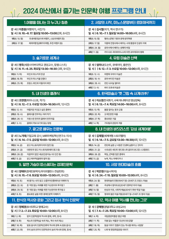ÀÌ ÇÁ·Î±×·¥Àº ¡®À¯·´ ¹Ì¼ú°ü »êÃ¥¡¯, ¡®³» ÀλýÀÇ Å¬·¡½Ä¡¯, ¡®¿¾ ±×¸² ¼Ó »ç°è(ÞÌÌù)¡¯, ¡®±¤°í·Î ¹è¿ì´Â Àι®ÇС¯, ¡®°æÁ¦ Àι®ÇС¯, ¡®ÇÑ½Ä Àι®ÇС¯ µî 12°³ ÇÁ·Î±×·¥À̸ç, 6¿ù 10ÀϺÎÅÍ 7¿ù 25ÀϱîÁö ÇÁ·Î±×·¥º° 2~4ȸ(ȸ´ç 2~3½Ã°£) ¿î¿µµÈ´Ù.