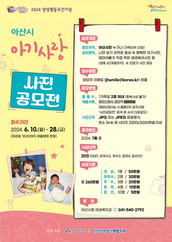 ¾Æ»ê½Ã(½ÃÀå ¹Ú°æ±Í) ¿©¼º´ÜüÇùÀÇȸ(ȸÀå À庹¿¬)´Â 2024³â ¾ç¼ºÆòµîÁÖ°£À» ±â³äÇØ ¡®¾Æ»ê½Ã ¾Æ±â»ç¶û »çÁø °ø¸ðÀü¡¯À» °³ÃÖÇÑ´Ù.