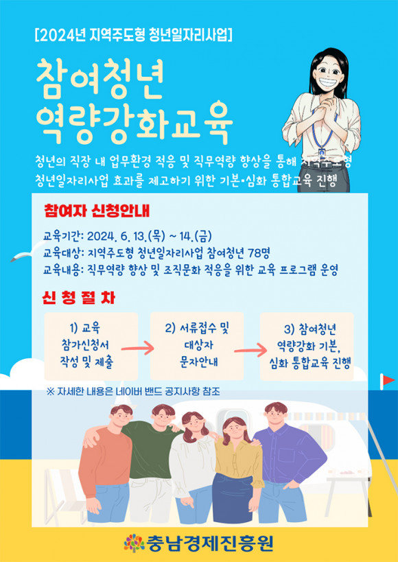ÃæÃ»³²µµ¿Í (Àç)Ãæ³²°æÁ¦ÁøÈï¿ø(¿øÀå ±èÂù¹è, ÀÌÇÏ ÁøÈï¿ø)ÀÌ ¿î¿µ ÁßÀÎ ¡®Áö¿ªÁÖµµÇü û³âÀÏÀÚ¸®»ç¾÷¡¯ Âü¿©Ã»³â ´ë»ó Á÷¹«¿ª·® °È ±³À°À» ³»´Þ 13ÀϺÎÅÍ 14ÀϱîÁö ½Å¶ó½ºÅ×ÀÌ Ãµ¾È(õ¾È½Ã ¼ÒÀç)¿¡¼ °³ÃÖÇÑ´Ù.