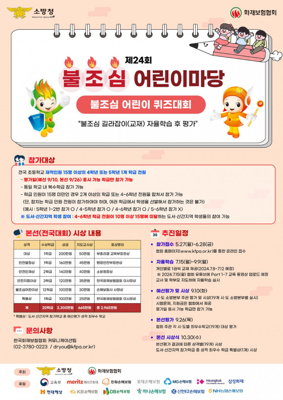 ¼Ò¹æÃ»°ú Çѱ¹ÈÀ纸ÇèÇùȸ°¡ °øµ¿ ÁÖÃÖÇÏ´Â ¡®ºÒÁ¶½É ¾î¸°À̸¶´ç¡¯Àº ÈÀ硤ÀÚ¿¬Àç³ ¹× »ýȰ¾ÈÀü¿¡ °üÇÑ ±âÃÊÁö½ÄÀ» ÇнÀ ÈÄ Æò°¡¸¦ ÅëÇØ ¾î¸°À̵éÀÇ ¾ÈÀü¹®È È®»êÀ» À§ÇØ ¸Å³â ½ÃÇàµÇ°í ÀÖ´Ù.