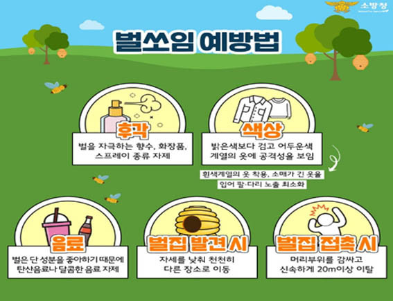 ¹ú ½îÀÓ »ç°í¸¦ ¿¹¹æÇϱâ À§Çؼ´Â ¡ãÈò»ö °è¿ÀÇ ±ä ¼Ò¸Å ¿Ê Âø¿ë ¡ã¹úÀ» ÀÚ±ØÇÏ´Â Çâ¼ö³ª ÈÀåǰ µîÀÇ »ç¿ë ÀÚÁ¦ ¡ã¹úÀÌ °ø°Ý ½Ã ¸Ó¸® ºÎÀ§¸¦ °¨½Î°í ½Å¼ÓÇÏ°Ô 20m ÀÌ»ó ÀÌÅ»ÇÏ´Â µî ¾ÈÀü¼öÄ¢À» ÁؼöÇØ¾ß ÇÑ´Ù.