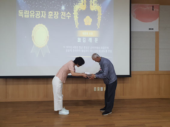 ¶ÇÇÑ 2019³â 3?1Àý °è±â Æ÷»ó ´ë»óÀÚ·Î °áÁ¤µÇ¾úÁö¸¸ À¯Á·À» ãÁö ¸øÇØ ÈÆÀåÀ» Àü¼öÇÏÁö ¸øÇÑ Íº±è·¡¹® Áö»çÀÇ À¯Á·ÀÌ Á¦65Â÷ ±¹°¡º¸ÈƺΠµ¶¸³À¯°øÀÚ ÈļÕÈ®ÀÎÀ§¿øÈ¸¿¡¼ È®Àεʿ¡ µû¶ó ¼ÕÀڳ࿡°Ô ÈÆÀåÀ» Àü¼öÇß´Ù.