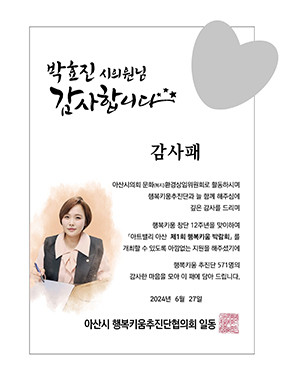 ¹ÚÈ¿Áø ÀÇ¿øÀº ¾Æ»ê½ÃÀÇȸ ¹®Èȯ°æÀ§¿øÈ¸¿¡¼ Ȱµ¿ÇÏ¸é¼ ÇູŰ¿òÃßÁø´Ü°ú Çù·ÂÇÏ¿© ÇູŰ¿ò ¹Ú¶÷ȸ ¿¹»êÈ®º¸ µî Áö¿ª»çȸÀÇ º¹Áö Çâ»ó¿¡ Å« ±â¿©¸¦ ÇØ¿Ô´Ù.