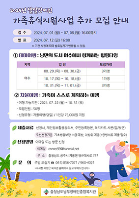 | | ¡è¡è <Á¦°ø=ÃæÃ»³²µµ³²ºÎÀå¾ÖÀÎÁ¾ÇÕº¹Áö°ü> | ¨Ï (ÁÖ)¿Â¾ç½Å¹®»ç | ÃæÃ»³²µµ³²ºÎÀå¾ÖÀÎÁ¾ÇÕº¹Áö°ü(°üÀå ±èÅ¿ì)´Â ¿À´Â 8ÀϱîÁö ¹ß´ÞÀå¾ÖÀÎ °¡Á·ÈÞ½ÄÁö¿ø»ç¾÷ Âü¿© °¡Á·À» Ãß°¡ ¸ðÁýÇÑ´Ù. Ãß°¡¸ðÁý ¿©Çà À¯ÇüÀº Å׸¶¿©Çà, ÀÚÀ²¿©Çà(´çÀÏ)ÀÌ´Ù.