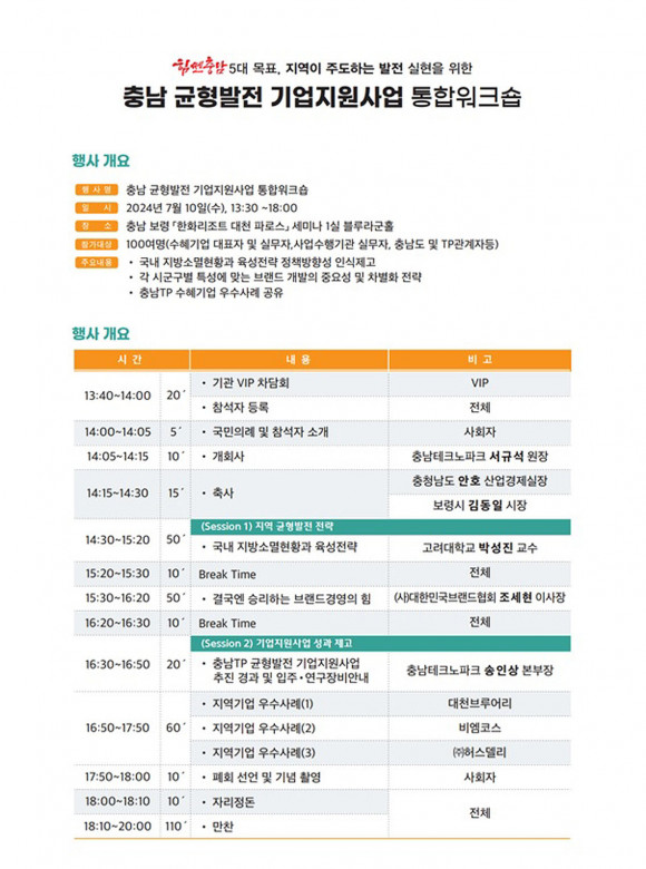 (Àç)Ãæ³²Å×Å©³ëÆÄÅ©(ÀÌÇÏ Ãæ³²TP)´Â 7¿ù 10ÀÏ Ãæ³² º¸·É½Ã ¼ÒÀç ÇÑȸ®Á¶Æ®¿¡¼ ¡®Ãæ³²±ÕÇü¹ßÀü ±â¾÷Áö¿ø»ç¾÷ ÅëÇÕ¿öÅ©¼ó¡¯À» °³ÃÖÇÑ´Ù°í ¹àÇû´Ù.