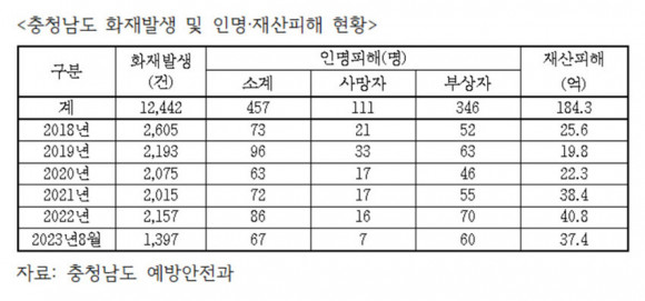 2018³â ÀÌÈÄ ÈÀç·Î ÀÎÇØ ÃÑ 457¸íÀÇ ÀθíÇÇÇØ°¡ ¹ß»ýÇßÀ¸¸ç, ÀÌÁß 111¸íÀÌ »ç¸ÁÇß´Ù. Àç»êÇÇÇØ ±Ô¸ðµµ 184¾ï ¿ø¿¡ ´ÞÇϸç, Àç»êÇÇÇØ´Â Á¡Â÷ ´Ã°í ÀÖ´Â Ãß¼¼ÀÌ´Ù.