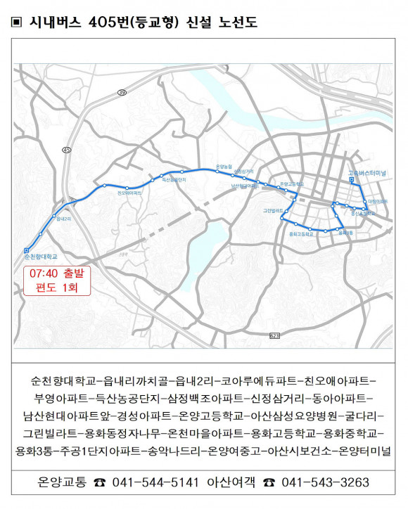 405¹ø ¹ö½ºÀÇ ÁÖ¿ä Á¤·ùÀå °æÀ¯ ½Ã°£Àº ÄھƷ翡µàÆÄÅ©(07:44), Ä£¿À¾Ö(07:45), µæ»êµ¿ ºÎ¿µ¾ÆÆÄÆ®(07:49), ¿Â¾ç°íµîÇб³(07:56), ¿ëȰíµîÇб³(08:06), ¿Â¾ç¿©Áß¡¤°í(08:10) µîÀÌ´Ù.