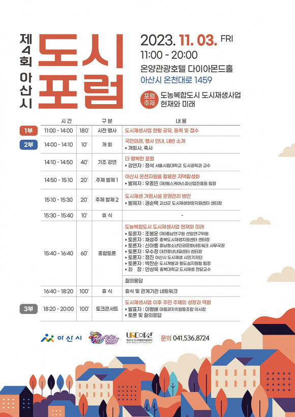 Æ÷·³Àº 1~3ºÎ·Î ³ª´² ÁøÇàµÇ¸ç 1ºÎ¿¡¼´Â ¾Æ»ê½Ã µµ½ÃÀç»ý»ç¾÷ ÇöȲÀ» °øÀ¯Çϰí 2ºÎ¿¡´Â ±âÁ¶ °¿¬ ¹× ÁÖÁ¦ ¹ßÁ¦, 3ºÎ¿¡¼´Â ÁÖ¹ÎÀÌ Âü¿©ÇÏ´Â ÅäÅ©ÄܼƮ·Î ÁøÇàµÈ´Ù.