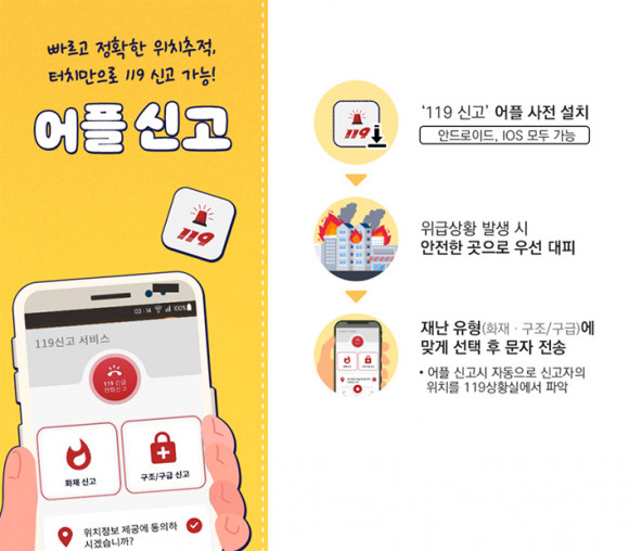 ƯÈ÷ ¾ÖÇø®ÄÉÀ̼ÇÀ» ÅëÇØ »çÀü ¼³Ä¡ ÈÄ ¾ÛÀ» ÅëÇÑ ½Å°í´Â Àç³ À¯Çü(ÈÀ硤±¸Á¶¡¤±¸±Þ)¿¡ ¸Â°Ô ¼±Åà ÈÄ ¹®ÀÚ¸¦ º¸³» ½Å°íÇϸé ÀÌ °æ¿ì ½Å°íÀÚÀÇ GPS À§Ä¡Á¤º¸°¡ 119Á¾ÇÕ»óȲ½Ç·Î Àü¼ÛµÇ±â ¶§¹®¿¡ ºü¸£°í Á¤È®ÇÑ À§Ä¡ÃßÀû ¹× ÅÍÄ¡¸¸À¸·Î 119¿¡ ½Å°íÇÒ ¼ö ÀÖ´Ù.