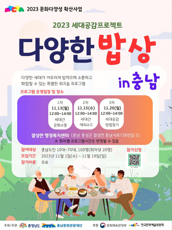 Ãæ³²¹®È°ü±¤Àç´Ü(´ëÇ¥ÀÌ»ç ¼Èï½Ä)Àº 11¿ù 9ÀϺÎÅÍ 19ÀϱîÁö Ãæ³² È«¼º±º °á¼º¸é ÇàÁ¤º¹Áö¼¾ÅÍ¿¡¼, ÀþÀº¼¼´ë¿Í ½Ç¹ö¼¼´ë°¡ ´Ù¾çÇÑ ÁÖÁ¦·Î ÀǰßÀ» ³ª´©°í ¼ÒÅëÇÏ´Â <¼¼´ë°ø°¨ ÇÁ·ÎÁ§Æ® - ´Ù¾çÇÑ ¹ä»ó>ÀÇ Âü¿©ÀÚ¸¦ ¸ðÁýÇÑ´Ù°í ¹àÇû´Ù.