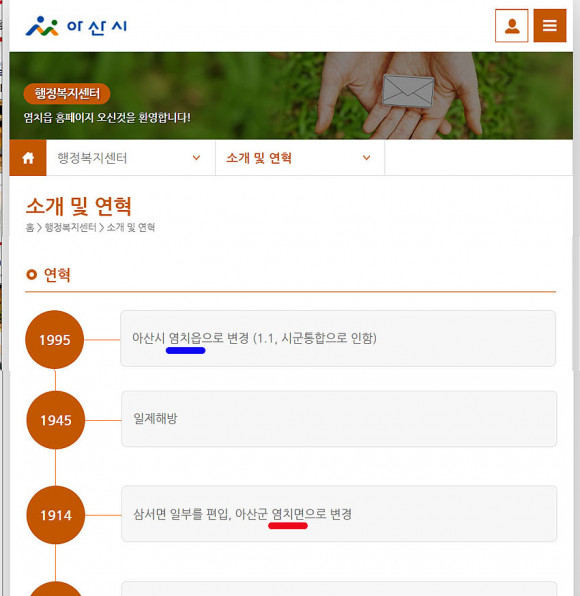 | | ¡è¡è ¡ã¿°Ä¡À¾ÇàÁ¤º¹Áö¼¾ÅÍ È¨ÆäÀÌÁö ¿¬Çõ Áß ¿À·ù ºÎºÐ | ¨Ï ¿Â¾ç½Å¹® | | ¶ÇÇÑ ÇöÀç ¿°Ä¡À¾ ÇàÁ¤º¹Áö¼¾ÅÍ È¨ÆäÀÌÁö¿¡µµ ¡®1914³â »ï¼¸é ÀϺθ¦ ÆíÀÔ, ¾Æ»ê±º <¿°Ä¡¸é>À¸·Î º¯°æ¡¯À¸·Î Ç¥±âµÅ Àִ¿¡ ÀÌ ¶ÇÇÑ ¾Õ¼ ¾Æ»ê½Ã ¿¬ÇõóÇè À߸øµÈ Ç¥ÇöÀ̶ó´Â °ÍÀÌ´Ù.
