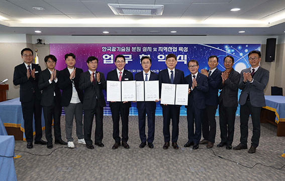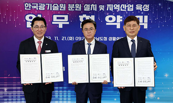 µµ´Â 11¿ù 21ÀÏ µµÃ» »óȲ½Ç¿¡¼ ±èÅÂÈì Áö»ç¿Í ¹Ú°æ±Í ¾Æ»ê½ÃÀå, ½Å¿ëÁø Çѱ¹±¤±â¼ú¿øÀåÀÌ ¡®Çѱ¹±¤±â¼ú¿ø(KOPTI) Ãæ³² ºÐ¿ø ¼³Ä¡ ¹× Áö¿ª»ê¾÷ À°¼ºÀ» À§ÇÑ Çù¾à¡¯À» ü°áÇß´Ù°í ¹àÇû´Ù.