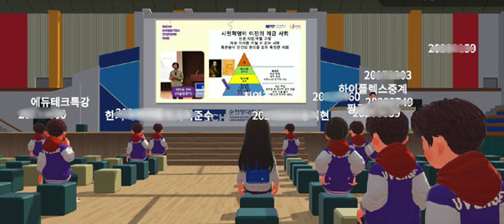 ÃÖ÷´Ü ÇÏÀÌÇ÷º½º ±³À° ½Ã½ºÅÛÀÌ ¼³Ä¡µÈ ½ÇÁ¦ °Àǽǿ¡¼ ±³¼öÀÚ°¡ °ÀǸ¦ ÁøÇàÇϸé, Å©·Î¸¶Å° È¿°ú¸¦ ÅëÇØ ¸ÞŸ¹ö½º °ÀǽǷΠ±³¼öÀÚÀÇ °Àǰ¡ ½Ç½Ã°£À¸·Î ¼ÛÃâµÇ°í, ÇлýµéÀº ¾Æ¹ÙŸ¸¦ ÅëÇØ ¸ÞŸ¹ö½º °Àǽǿ¡¼ °ÀǸ¦ µè°í, ½ÇÁ¦ °Àǽǿ¡ ÀÖ´Â Çлýµé°ú ½Ç½Ã°£ ¼ÒÅëÇÏ¸ç ¼ö¾÷À» ¹ÞÀ» ¼ö ÀÖ´Ù.
