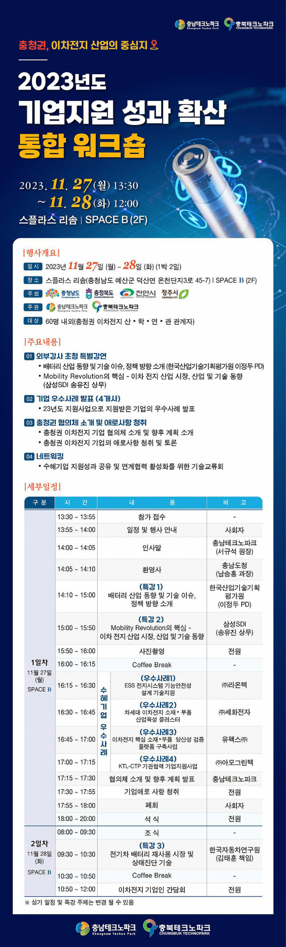 À̹ø ¿öÅ©¼óÀº Ãæ³²µµ, ÃæºÏµµ, õ¾È½Ã, ûÁֽð¡ ÁÖÃÖÇϰí Ãæ³²Å×Å©³ëÆÄÅ©¿Í ÃæºÏÅ×Å©³ëÆÄÅ©°¡ ÁÖ°üÇÑ Çà»ç·Î ¹èÅ͸® »ê¾÷ µ¿Çâ°ú Á¤Ã¥¿¡ ´ëÇØ ³íÀÇÇϰí, 2023³â ÀÌÂ÷ÀüÁö »ê¾÷ Áö¿ø»ç¾÷ÀÇ ¼º°ú °øÀ¯¿Í È®»êÀ» À§ÇØ °³ÃֵȴÙ.